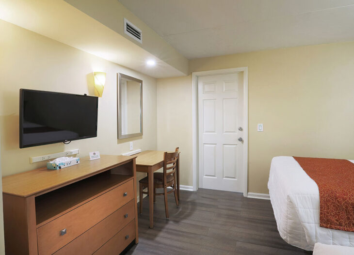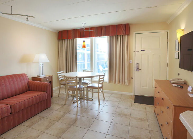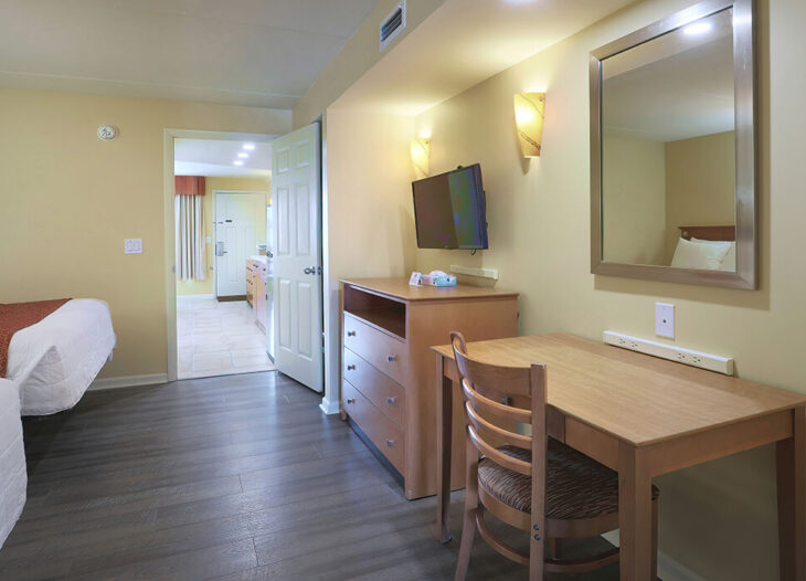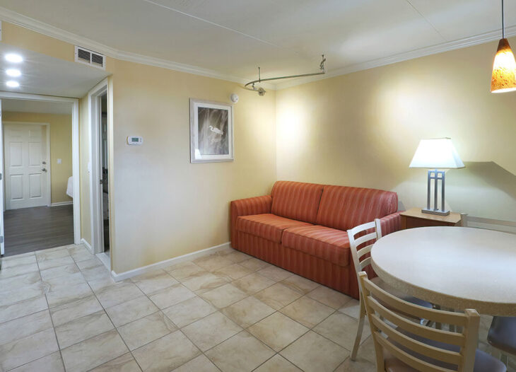 One bedroom deluxe efficiency suite. Two double beds, sofa bed, nicely equipped kitchenette, 2 tvs, and central AC. Located over the pool with an ocean front view.